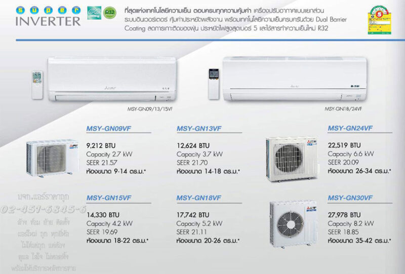 แอร์ MITSUBISHI MSY-GN24VF | ขนาด 22519 บีทียู | SUPER INVERTER | ปี 2017 | น้ำยาแอร์ R32 | เบอร์ 5
