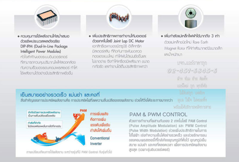 - Inverter ระบบประหยัดพลังงานสูงสุดด้วยด้วยการลดรอบของคอมเพรสเซอร์ให้อุณหภูมิเย็นสบายแม่นยำ